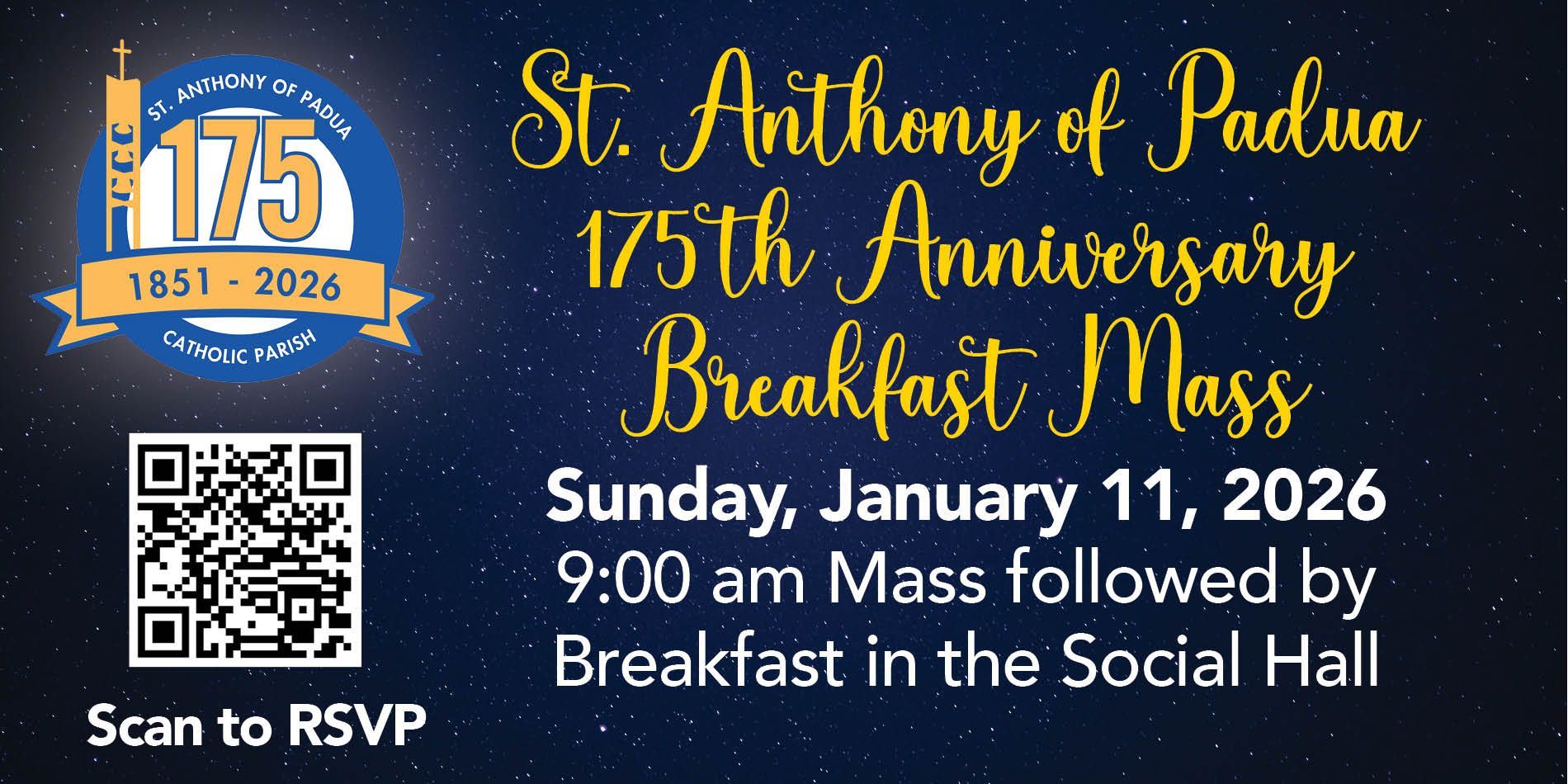 On Sunday, January 11, 2026, we begin our 175th Anniversary Year with a special Parish Community Breakfast, hosted by our Scouts, immediately following the Kickoff Mass. We hope you and your family will join us for this joyful celebration of faith and community.