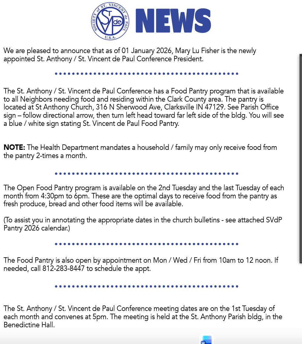 The St. Vincent de Paul Society is a group of individuals who work on a voluntary basis, serving the spiritual and material needs of the needy. The St. Vincent de Paul Society of St. Anthony Parish serves individuals in need in Clark County, Indiana.